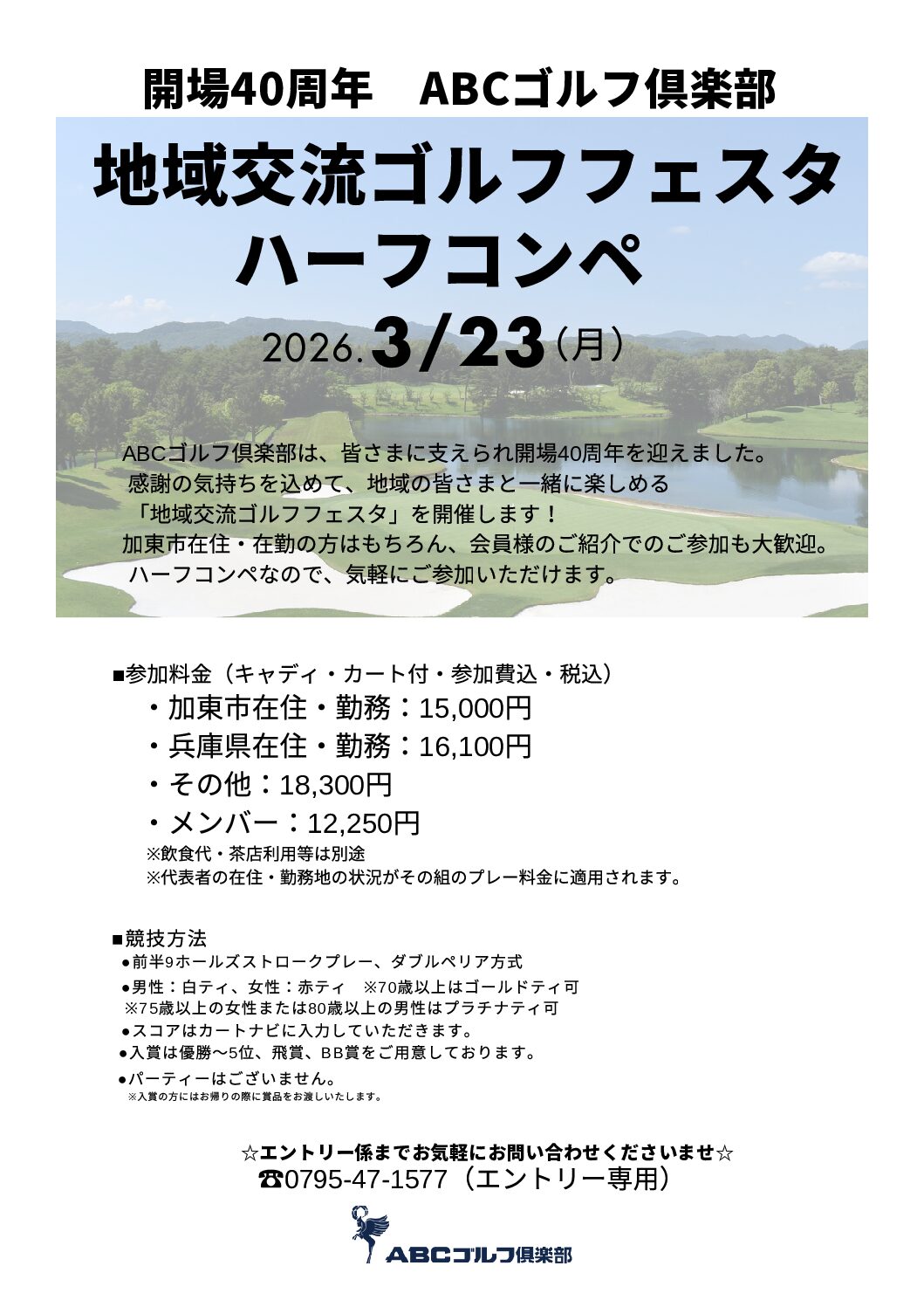 HOMEお知らせ一覧【ご案内】地域交流ゴルフフェスタハーフコンペに参加しませんか? 【ご案内】地域交流ゴルフフェスタハーフコンペに参加しませんか? 2026.02.12 ABCゴルフ俱楽部にて地域交流ゴルフフェスタハーフコンペが開催されます! ご都合の合う方はぜひご参加くださいませ! お申し込みは直接ABCゴルフ俱楽部様へお問い合わせください。